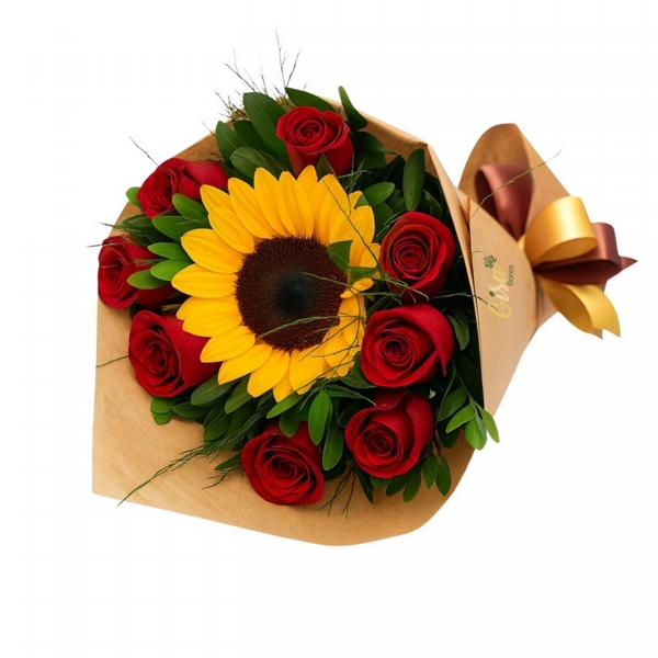 Lindo Buquê com 8 rosas vermelhas e um girassol no meio
