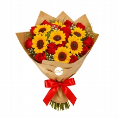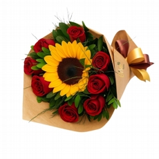Buquê especial de rosas vermelhas e girassois em esponja floral