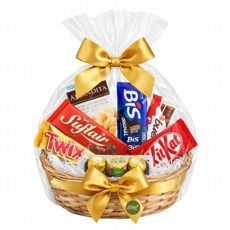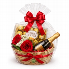 Cesta com Arranjo de Duas Rosas, Baby Chandon e Ferrero Rocher 12 Unidades