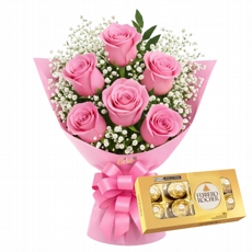 Buque de 6 rosas rosadas + Ferrero rocher