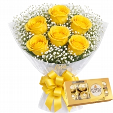 Buque tradicional com 6 rosas amarelas + Ferrero Rocher
