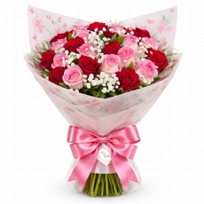 Arranjo de rosas vermelhas e rosadas em vaso de vidro