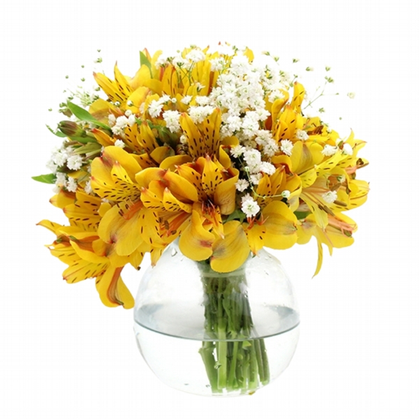 Transmita alegria e energia com este belíssimo arranjo de astromélias amarelas, simbolizando prosperidade e felicidade. O toque delicado das gipsofilas complementa a composição, tornando-o perfeito para iluminar qualquer ambiente ou presentear em ocasiões especiais como aniversários, agradecimentos ou felicitações.