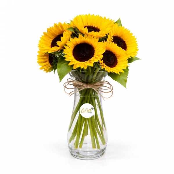 Esse arranjo é montado em vaso com água, permitindo a hidratação direta das flores e ajudando a manter sua beleza e frescor por mais tempo. A disposição dos girassóis cria um visual alegre, equilibrado e harmonioso.