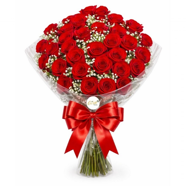 Surpreenda com a intensidade e a elegância deste buquê composto por 30 rosas vermelhas, realçadas pelo toque delicado das gipsófilas. Uma combinação clássica e sofisticada, perfeita para expressar amor, paixão e admiração de forma marcante e inesquecível.