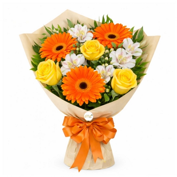 Trabalhamos com flores naturais, por isso é normal que haja pequenas variações de tamanho, formato e tonalidade. Este buquê é composto por gérberas, rosas e astromélias. As gérberas podem ser enviadas mais abertas ou mais fechadas, podendo conter redinhas de proteção para garantir sua integridade. As rosas podem apresentar variações no tamanho, tonalidade e estágio de abertura. Já as astromélias também podem variar em cor, formato e quantidade de flores por haste, além de poderem ser enviadas em diferentes estágios de abertura, conforme o ponto natural no momento da montagem. Essas características são próprias do produto e independem do controle da Gisa Flores.