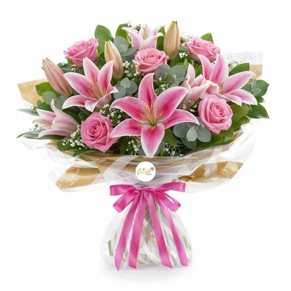 O Buquê com Lírios e Rosas Rosadas é uma escolha elegante e delicada, ideal para transmitir carinho, admiração e afeto. A combinação das rosas em tons suaves com a sofisticação dos lírios cria um arranjo harmonioso e encantador, perfeito para presentear em momentos especiais.
