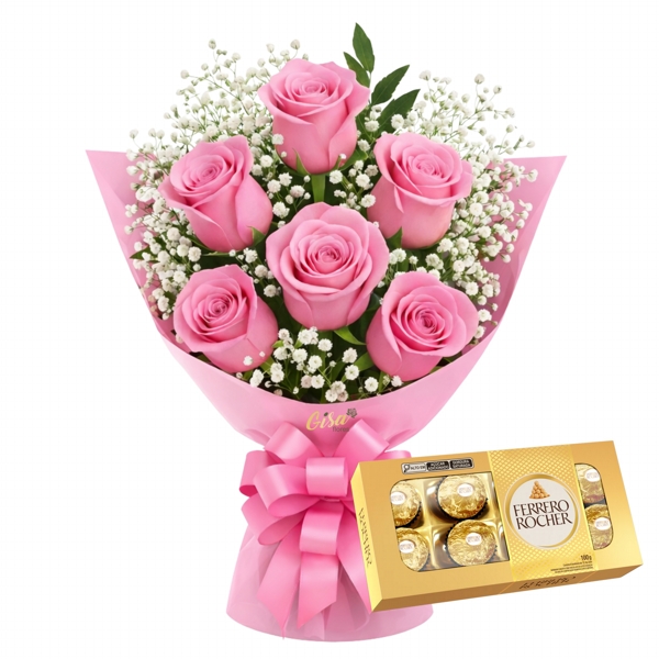 O Buquê de 6 Rosas Rosadas com Ferrero Rocher é uma opção delicada e encantadora, perfeita para transmitir carinho, afeto e doçura. A suavidade das rosas rosadas combinada com o toque especial do chocolate cria um presente elegante e significativo, ideal para surpreender em momentos especiais.