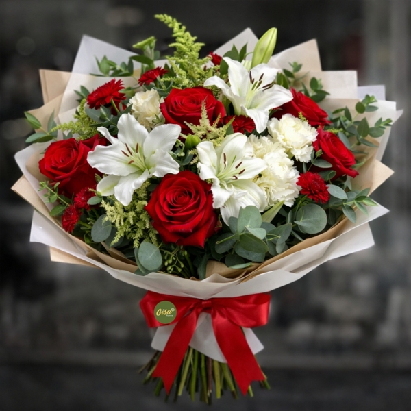 Surpreenda quem você ama com este buquê exuberante, que combina a intensidade das rosas vermelhas com a sofisticação dos lírios e a leveza das cravinas. Um arranjo harmonioso, ideal para datas especiais, declarações de amor e momentos marcantes.