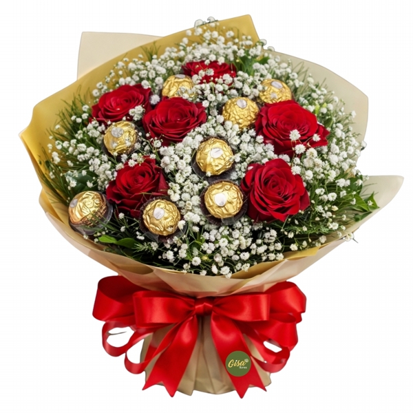 Clássico, romântico e irresistível. Este buquê tradicional de rosas vermelhas simboliza paixão, amor e sentimentos intensos, acompanhado de 8 bombons Ferrero Rocher, tornando o presente ainda mais especial e marcante para ocasiões românticas.
