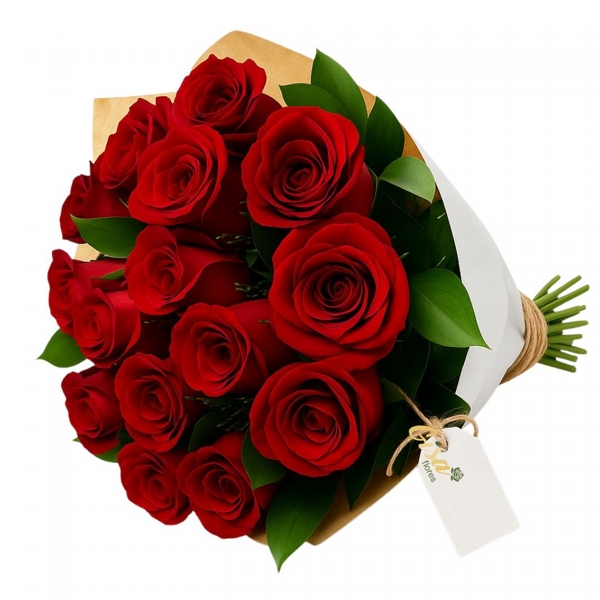 Quinze magníficas rosas vermelhas compõem esse belíssimo buquê romântico e inesquecível.