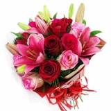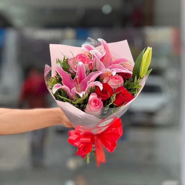 Um buquê sofisticado e encantador que combina a beleza das rosas com a elegância dos lírios, criando uma harmonia perfeita para momentos inesquecíveis.
