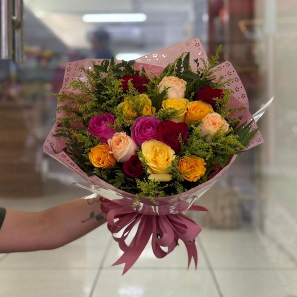 Este buquê tradicional com 15 rosas coloridas é uma escolha alegre e cheia de personalidade, ideal para transmitir carinho, felicidade e boas energias. A combinação de diferentes cores de rosas representa uma variedade de sentimentos, como amor, amizade, gratidão e admiração, resultando em um arranjo vibrante, harmonioso e perfeito para presentear em diversas ocasiões.