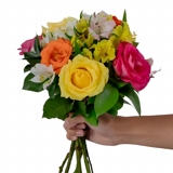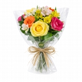 Buquê delicado e encantador composto por 8 flores, sendo rosas e astromélias em cores variadas, cuidadosamente selecionadas para criar uma composição harmoniosa.