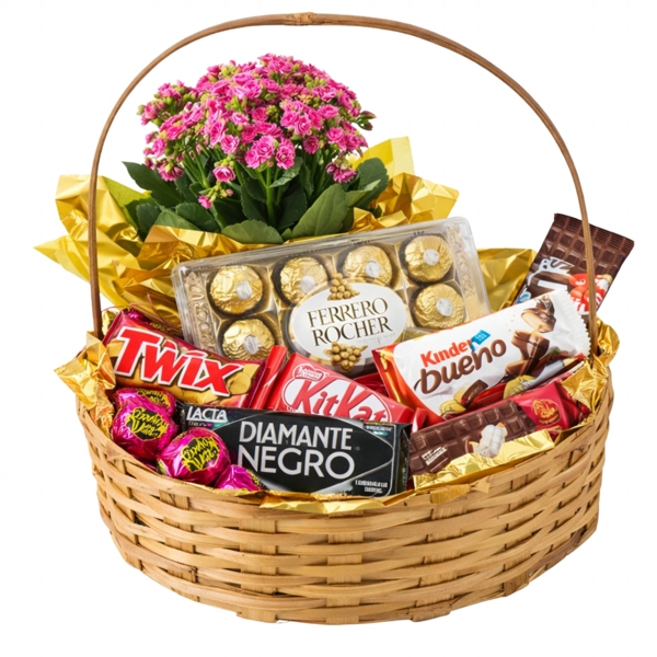 Uma deliciosa cesta de café da manhã incluindo diversas guloseimas. São variedades de chocolate, bombons Sonhos de Valsa, chocolates em barra e um arranjo delicado de flores.