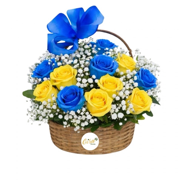 Uma composição vibrante que une fé, alegria e boas energias. Este arranjo em cesta combina rosas azuis e amarelas, envoltas por flores delicadas e folhagens, criando um contraste harmonioso e cheio de significado. O azul remete à tranquilidade e à proteção, enquanto o amarelo simboliza prosperidade, luz e caminhos abertos.