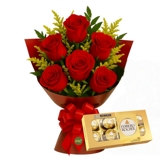 Este combo com buquê de 6 rosas vermelhas e Ferrero Rocher é uma opção clássica e encantadora, ideal para expressar amor, carinho e admiração com um toque especial de doçura. As rosas vermelhas, símbolo do romance, combinadas ao chocolate, tornam esse presente perfeito para surpreender em momentos especiais.