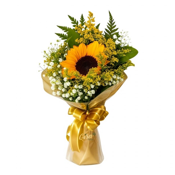 Este encantador buquê de girassol traz um toque de luz e alegria a qualquer ambiente. A energia vibrante do girassol, combinada com a delicadeza das gipsofilas e folhagens, cria uma composição única e deslumbrante. Perfeito para transmitir felicidade e gratidão, este buquê é ideal para presentes em ocasiões como aniversários, agradecimentos ou para celebrar momentos especiais com quem você ama.