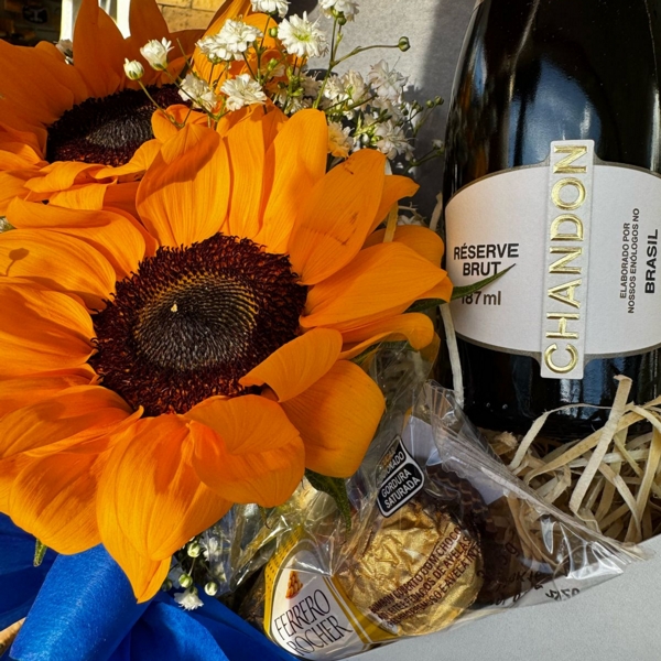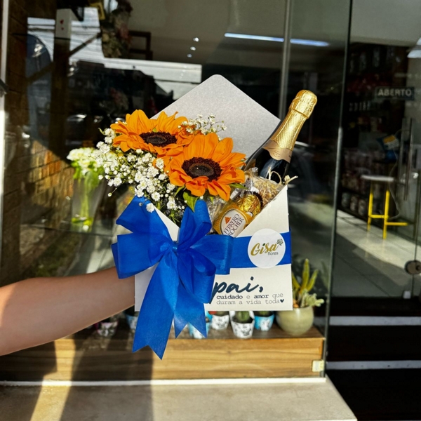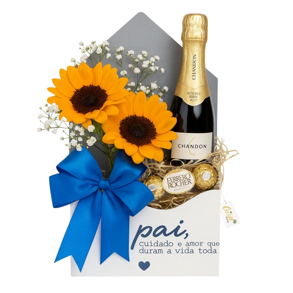 Surpreenda o seu herói com um presente cheio de significado! Esta charmosa caixa presenteável traz a força e o brilho dos girassóis, simbolizando admiração e gratidão, acompanhados de delicadas flores brancas, um espumante para brindar momentos inesquecíveis e deliciosos chocolates Ferrero Rocher. Um gesto que celebra o cuidado, o amor e a presença paterna que duram a vida toda.