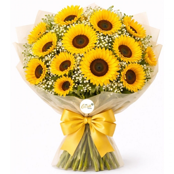 Um buquê marcante e cheio de energia, ideal para transmitir alegria, otimismo e sentimentos positivos. Com sua coloração vibrante e presença imponente, os girassóis tornam esse arranjo uma escolha perfeita para surpreender e encantar em qualquer ocasião especial.